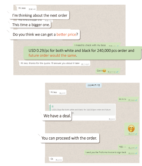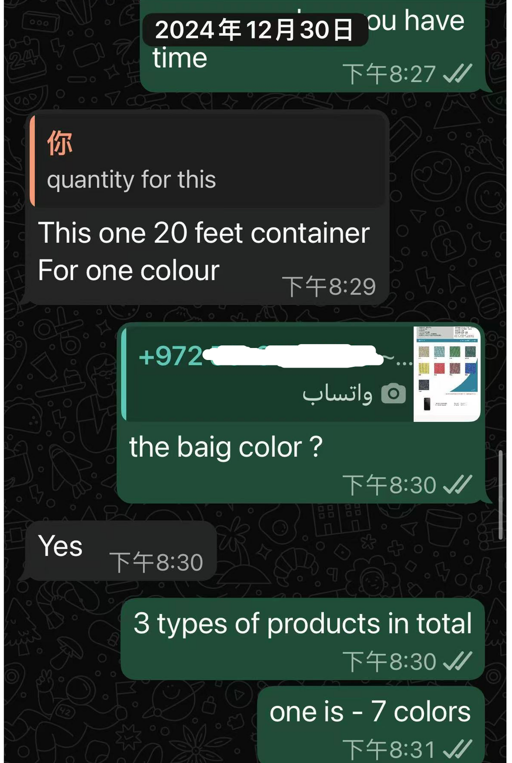 這筆來自 中東地區的 20 呎貨櫃訂單,並不是一夜之間完成的。一開始,客戶透過 WhatsApp 傳來詢價訊息,簡單幾句:「這款布料有幾種顏色?可以報個價嗎?」