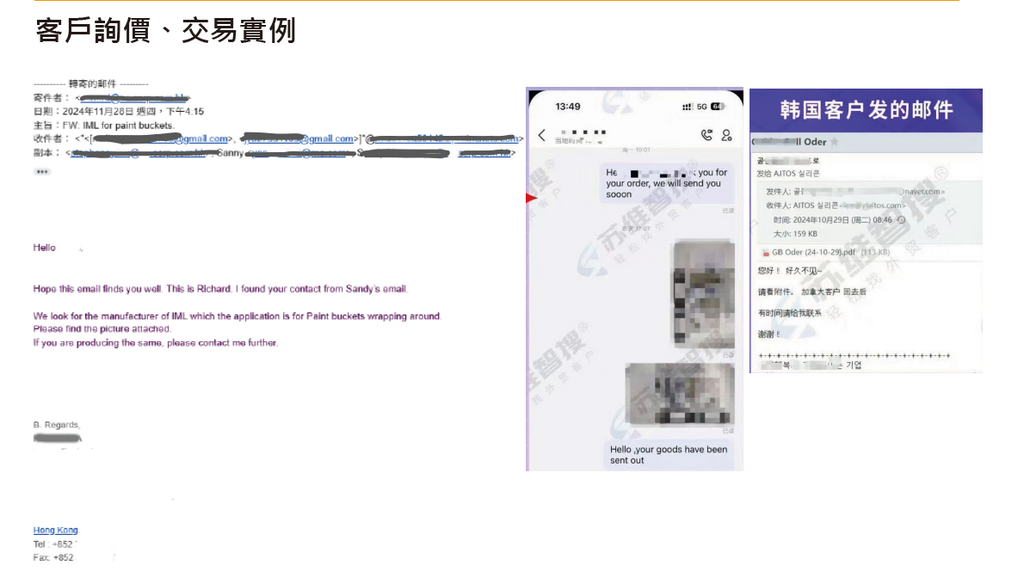 我們立即協助台灣企業快速回覆,提供 產品規格、配色方案與報價。同時啟動 背景調查,分析對方過去的 進口紀錄、採購偏好與供應鏈結構,確認這位客戶不只是隨便問問,而是有明確需求、正在尋找 替代供應商。